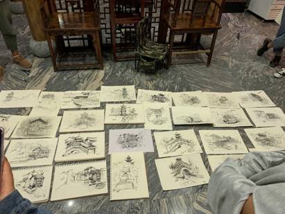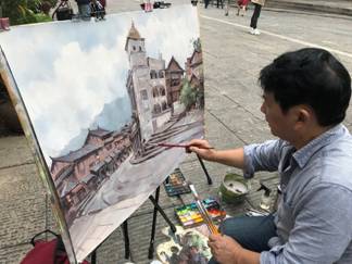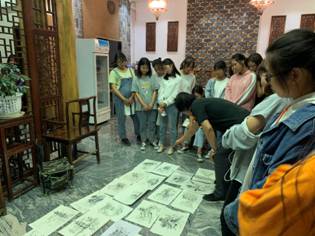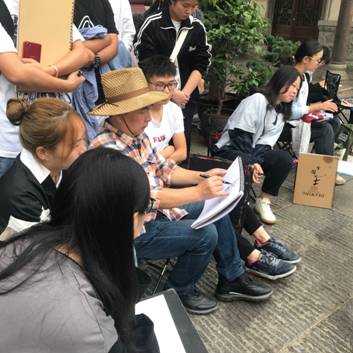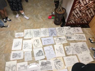 根据计划安排,10月9日-10日训练同学们的速写能力。白天,六名专业老师带领各自负责的员工们开始了为期两天的速写训练。老师们根据下司古镇的整体布局、建筑造型、现实风景选取了不同的地点进行写生。在同学们开始创作之前,老师们重点给同学们讲解了选景的技巧、构图形式和不同物体的画法。提醒同学们作画不仅仅是直接抓取形象结构,也是环境意境的表达,更是表现了审美情趣。老师们和同学们快速地投入到了作画的状态之中。晚上,老师们对白天同学们的速写作品进行一一评讲,指出一些不足的问题。虽然只有短短两天的速写训练,但是同学们认真听取了老师们的建议后,都取得了较大的进步。