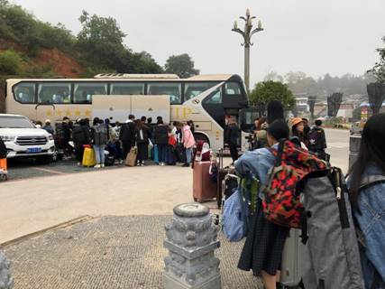 10月19号下午5点左右,4辆大巴车陆续到达学校。在各位老师与辅导员的指导下,男生与女生的互相帮助下,大家都顺利返回了铜梁校区。