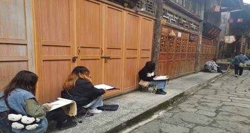 龚滩古镇依山而建,面朝乌江。错落有致的吊脚楼和石板路,在岁月的打磨下,处处都散发出古色古香的气息。师生在这里切身体会古镇的味道,坚持眼到、手到、心到进行作品创作。