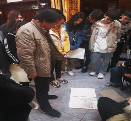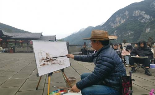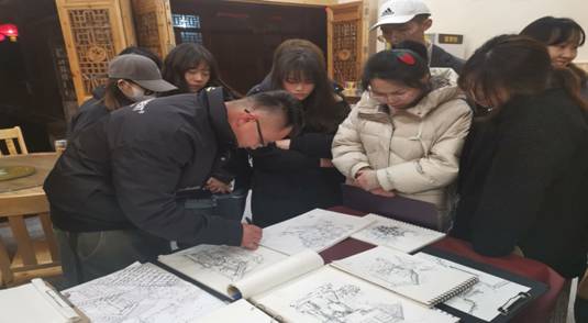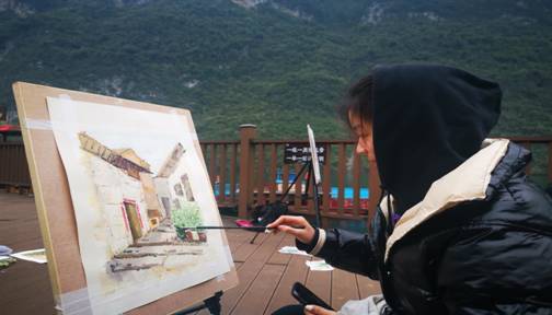 写生期间,专业老师首先带领各自班级在龚滩古镇熟悉环境,根据其整体布局、建筑造型,选出最优写生点;接着,老师们开始现场授课,讲解写生构图技巧、怎样观察思考积极发现自然之美,引导员工快速进入作画状态。通过几天的速写训练,同学们快速适应了户外写生,为后期色彩课程奠定基础。